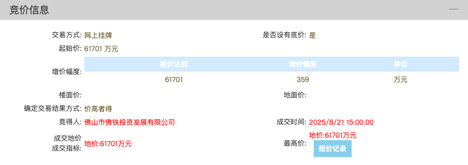 继8月4日佛山市佛铁投资发展有限公司以5.12亿元成功竞得南庄大道地块,成交楼面价定格在4650元/ ㎡后,仅隔大半月,佛铁投资在土地市场再度发力。 公开资料显示,此次拿下新地块的佛山市佛铁投资发展有限公司成立于2018年8月13日,是佛山市地铁 集团有限公司全资所有的国有二级企业。 8月21日,佛铁投资以底价61701万元顺利斩获禅城南庄绿岛湖片区一宗优质商住地。该地块占地面积约 3.77万㎡,最终折合楼面价为6550元/㎡。 信息来源:佛山造、佛山楼市、此前报道等 从出让文件的具体要求来看,这宗地块有着明确的规划指标。其占地面积为37679.9㎡,容积率不得高 于2.5.绿地率则需不低于30%,建筑限高为100米。在项目建设方面,整个项目的住宅楼高必须高于5 层,同时,项目须在1年内动工建设,并在3年内完成竣工,以确保项目能够尽快投入使用。 据了解,今年上半年,佛山地铁集团有限公司因"提前收车,灯光调暗,空调电梯节能"等卷入舆论漩 涡。今年上半年,据上海清算所披露的《佛山地铁集团有限公司2024年年报》显示,2024年佛山地铁集 团有限公司营业总收入5.86亿元,营业总成本26.89亿元,加上其他收益(一 ...