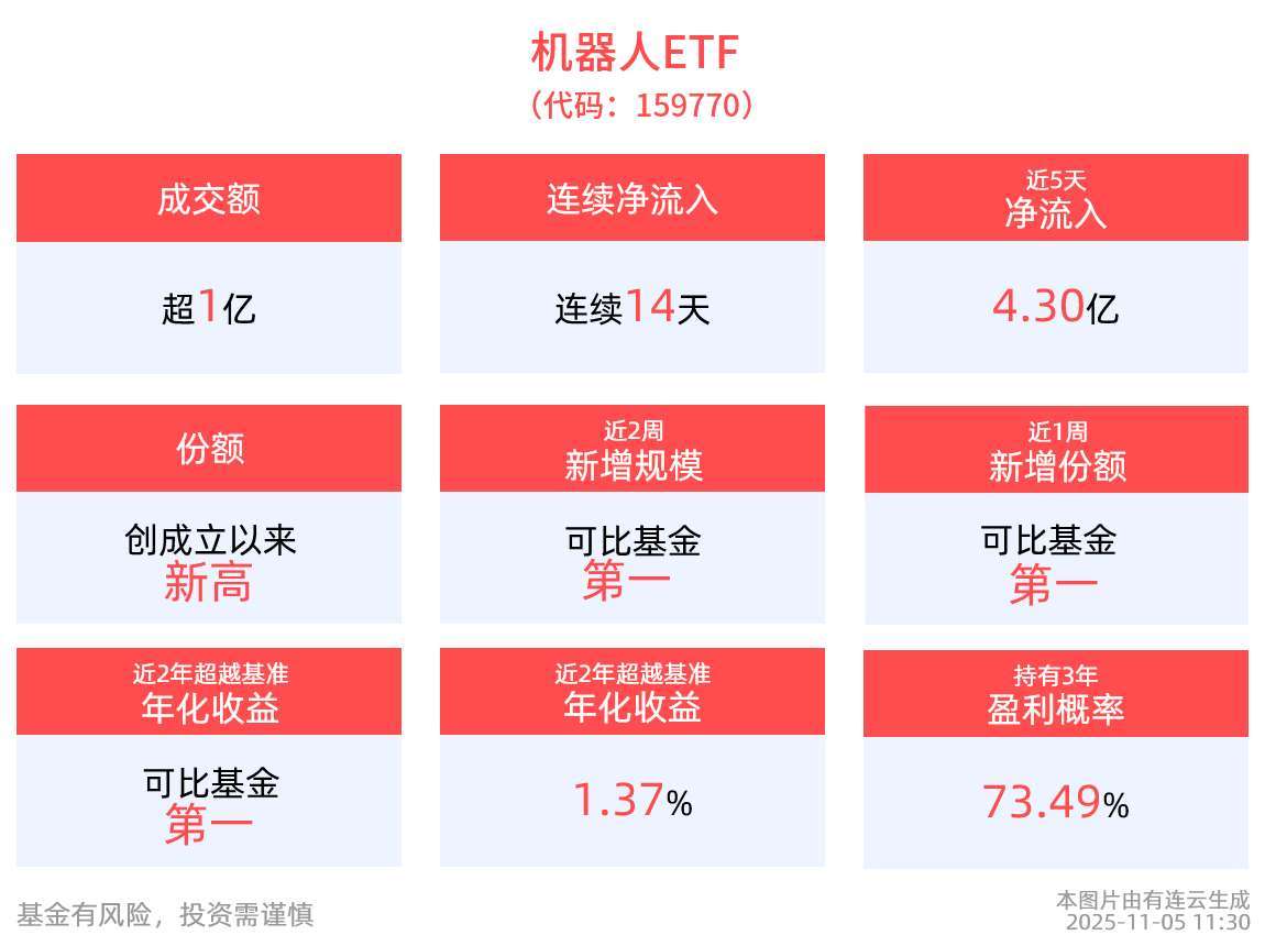 近五天狂揽超4.3亿元高居同类产品第一!机器人ETF(159770)半日净申购近7000万份,最新份额突破91亿份