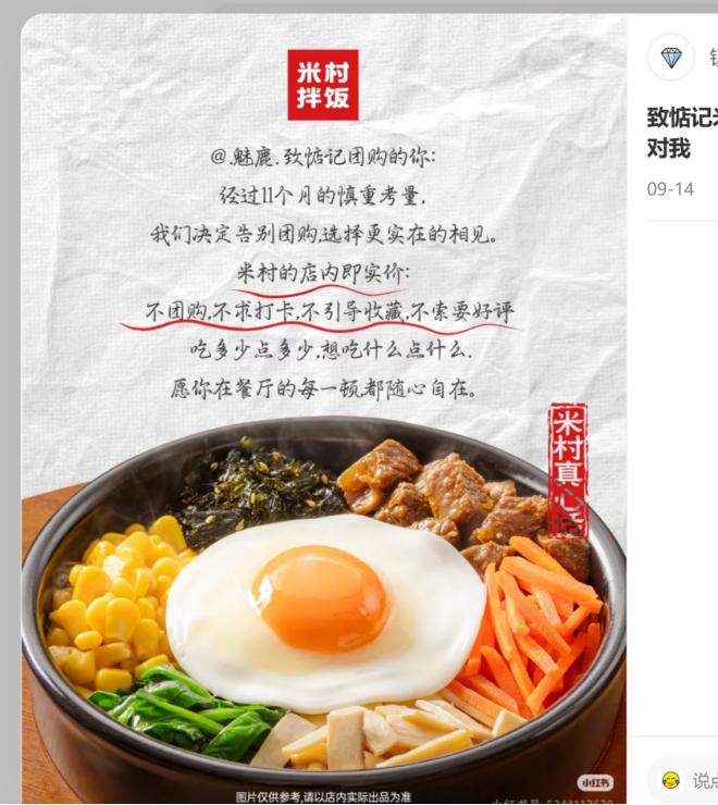 01 曾经我们吃饭前习惯性要掏手机看看有没有团购券的几家餐厅,比如米村拌饭、魏家凉皮,现在都纷纷 告别了折扣大战。 这可不是个别案例。数据显示,全国超过三成的餐饮企业正在主动下架团购。从头部连锁品牌到街头特 色小店,一场席卷餐饮圈的"去团购化"运动正悄然成势。 那么问题来了:曾经被视为引流利器的团购,为什么如今却被商家们集体抛弃? 场席卷餐饮圈的 "去团购化"运动正悄然成势 餐饮行业正掀起一场"去团购化"运动,头部品牌纷纷转身离去。美团报告显示,2023年全国23%的餐饮 企业不再参与团购,比前两年增长8个百分点。2024年,这一趋势持续加速,又增长了8.2个百分点。 1、头部品牌带头离场,团购失宠 今年6月,米村拌饭发布《致想念米村团购的你》公开声明,宣布"经过11个月深思熟虑,决定告别团 购,选择'实在'相见" 。该品牌在门店内推行"四不"原则:不团购、不求打卡、不引导收藏、不索要好 评。 与之相应,米村拌饭也开始放缓扩张节奏,推行"去考核化",不再把"好评率"和"出餐速度"作为硬性 KPI。 魏家凉皮的行动更为彻底。继2023年下架美团业务后,今年7月下旬又在西安、咸阳停了饿了么和自有 小程序的外卖,多 ...