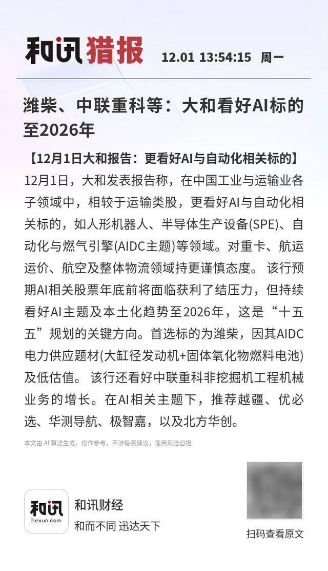 大和:看好AI与自动化相关标的 首选潍柴动力(02338)