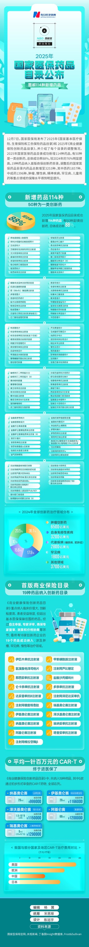 除传统的国家医保药品目录外,今年还新增了商业健康保险创新药目录,19种药品纳入其中,既有CAR-T等肿瘤治疗药品,也有 神经母细胞瘤、戈谢病等罕见病治疗药品,还有社会关注度较高的阿尔茨海默病治疗药品,商保创新药目录是对基本医保的有效补 充,患者可以通过商业保险,用上医保不覆盖的创新药。 国家医疗保障局医药服务管理司目录处处长 涂继莹:对商业健康保险来说,因为有国家背书,通过创新药物的品牌效应,能够 吸引更多的人来进行参保,实际上是降低了商业健康保险的获客成本。 央视网消息:12月7日,新版国家医保药品目录及首版商保创新药目录正式发布,114种药品成功纳入医保、19种新药进商保创新 药目录。全面升级后的药品目录,有助于满足民众多元化、多层次用药需求,让新药、好药更加可及,新版目录将于2026年1月1日在 全国范围内正式实施。 聚焦临床急需、医保可负担。本次目录调整新增114种药品,29种临床用不上或有更好替代的药品被调出目录。调整后的目录内 药品总数增至3253种,其中西药1857种、中成药1396种。此次调整有50种药品为一类创新药,创新药正以更快速度惠及患者,肿瘤、 慢性病、精神疾病、罕见病、儿童用药等重点 ...