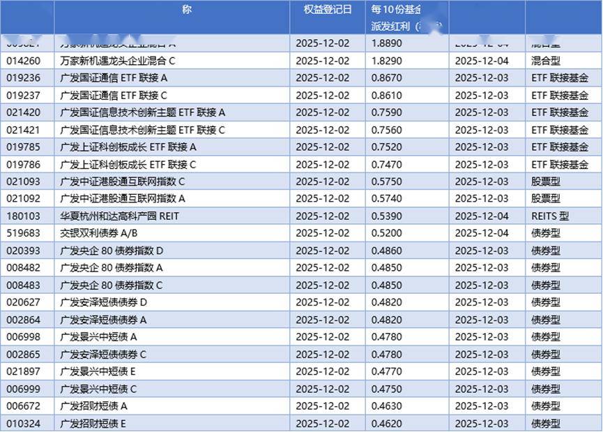 公募基金分红概况 - 截至12月2日,年内已有逾3300只基金实施分红,总额约2155.17亿元,分红数量、次数及金额均超越去年全年 [1] - 债券型基金是分红主力,贡献超1500亿元 [1] - 权益类产品分红同步加码,宽基ETF、红利主题基金和成长风格主动基金频频派现,“量价齐增”成为关键词 [1] 市场行情与资金动态 - 12月2日,A股三大股指收跌,沪指跌0.42%报3897.71点,深成指跌0.68%报13056.7点,创业板指跌0.69%报3071.15点,科创50指数跌1.24%报1320.16点 [1] - 沪深两市成交额1.59万亿元,全市场超3700只个股下跌 [1] - 截至12月2日,27家公募已将34只新品排进12月发行表,其中权益类仍占大头,为岁末市场增添增量资金 [2] - 多家机构认为年底多路增量资金有望同步入场,形成年度共振,公募、险资等正密集调研,筛选高景气且业绩兑现度高的标的 [2] 基金发行与分红详情 - 12月2日新发基金共有6只,主要为债券型基金和ETF联接基金 [2] - 12月2日基金分红40只,多为债券型,派发红利最多的基金是万家新机遇龙头企业灵活配置混合,每10份基金份额派发红利1.8890元 [2] - 当日分红基金列表显示,广发、富国、海富通、永赢等公司旗下多只债券型及ETF联接基金进行了分红 [3][4] 基金业绩表现 - 12月2日,单日业绩表现最好的基金为国投瑞银白银期货(LOF)A,日增长率为2.8362% [4] - 分投资类型看,股票型基金冠军为天弘恒生港股通高股息低波动指数C,日增长率为1.4659% [5] - 债券型基金冠军为平安惠嘉纯债债券C,日增长率为0.1078% [5] - 混合型基金冠军为恒生前海港股通价值混合C,日增长率为1.1787% [5] - ETF联接基金冠军为易方达恒生港股通高股息低波动ETF,日增长率为1.5487% [5] - LOF型基金冠军为国投瑞银白银期货(LOF)A,日增长率为2.8362% [5] - QDII基金冠军为富国恒生港股通高股息低波动ETF(QDII),日增长率为1.5373% [5] - 各类型基金日增长率TOP5榜单显示,港股通高股息、红利主题及白银期货相关基金表现突出 [6]