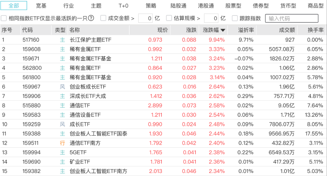 本报记者 彭衍菘 截至12月17日午间收盘,A股市场稀有金属板块表现抢眼,多只稀有金属ETF涨幅居前。 | 美肌 | 宽重 | 行业 主题 T+0 | 策略 | 陆股通 | 港股通 | 股票型 债券型 | 货币型 | 商品型 | | --- | --- | --- | --- | --- | --- | --- | --- | --- | | | | 相同指数ETF仅显示最活跃的一只② □ 成交金额 > | 0 亿 | 估算规模 > | 0亿 | 跟踪指数 | 输入代码 | | | 屋号 | 代码 | 类型 名称 | 现价 | 涨跌 | 涨跌幅 ▼ | 溢折率 | 成交额 | 换手率 | | 1 | 517160 | 主 长江保护主题ETF | 0.973 | 0.088 | 9.94% | 9.71% | 927 | 0.00% | | 2 | 159608 | 主 稀有金属ETF | 0.992 | 0.032 | 3.33% | 0.05% | 5057.08万 | 6.05% | | 3 | 159671 | 主 稀有金属ETF基金 | 1.211 | 0.038 | 3.24% | -0.07% | ...