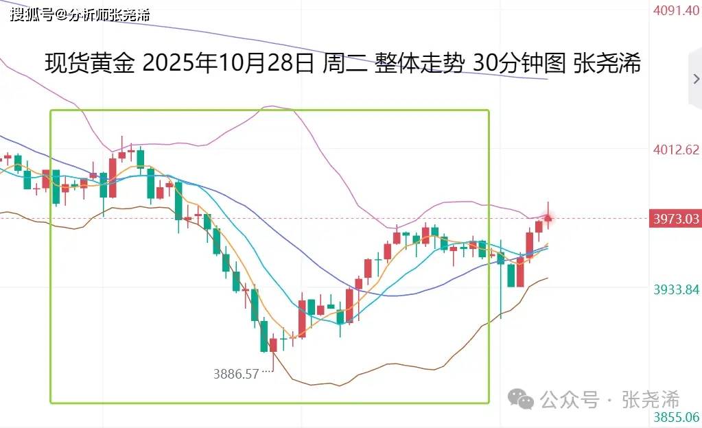 张尧浠:美联储决议来袭、金价初现止跌信号望筑底待回升 上交易日周二(10月28日):国际黄金震荡触底回升式收跌,其形态上,有止跌看涨的预期,这暗示下方空间有限,行情即将回落调整到位,并再度起涨攀 升。虽因市场还存在美国政府停摆解除后,以及美联储降息落地带来的卖事实下跌风险,但其带来的短线回落,也是多单入场的机会。 具体走势上,金价自亚市开于3981.44美元/盎司,先行于9点时段录得日内高点4019.41美元,之后遇阻回落持续走低,到欧盘17点时段录得日内低点 3886.32美元,最后触底回升,延续到美盘时段,虽有回撤,但仍维持回升模式,最终收于3952.30美元,日振幅133.09美元,收跌29.14美元,跌幅 0.73%。 影响上,因贸易改善前景削弱了黄金的避险吸引力,美方称将与日本签署4900亿美元投资协议.....现货黄金跌至三周低点,一度跌破3900美元,但由于特 朗普再度炮轰鲍威尔,以色列下令多次空袭加沙,市场产生逢低买盘而最终触底回升收线。 展望今日周三(10月29日):国际黄金亚市早盘开盘延续隔夜尾盘回撤之力后,又触底回升反弹。昨日的震荡止跌形态,产生了一定的买盘推动。但需稳健 看涨反弹,还需 ...