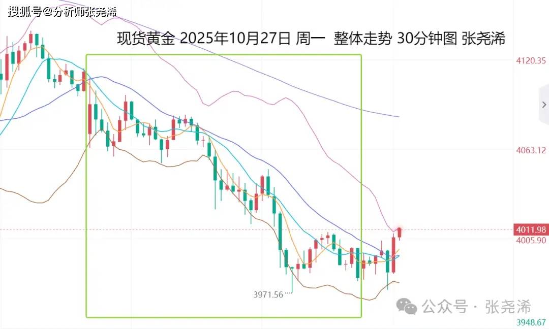 张尧浠:贸易待敲定及降息预落地、金价仍有再走低风险 上交易日周一(10月27日):国际黄金受周末贸易局势风险偏好压力,以及泽连斯基表示与盟友七至十天内制定停火方案,令避险需求降温,打压金价低开 回落走低刷新上周低点,并收跌至中轨支撑下方,空头力量加大,附图指标也维持空头信号发展,暗示后市将继续震荡或走低调整的行情发展为主。 具体走势上,金价自亚市低开于4078.89美元/盎司,迅速收复缺口录得日内高点4108.76 美元,之后遇阻回落,持续震荡走低,延续至美盘23点时段录得 日内低点3971.36美元,最后有所止跌触底回升,并维持3980美元上方震荡盘整,最终收于3981.20美元,日振幅137.4美元,相对于上周五收盘价4108.63美 元,收跌127.43美元,跌幅3.1%。 展望今日周二(10月28日):国际黄金开盘受到30日均线支撑附近买盘推动,有所止跌运行,另外,美元指数昨日及今日早盘走低表现,也对其金价产生一 定支撑。不过,在重回中轨或5-10日均线上方持稳前,仍偏弱震荡走低调整。暂维持高空或者是观望。 周线级别,金价自遇阻之前给出的趋势线压力位置,和9转序列反弹见顶看空信号验证后,展开回落走低, ...