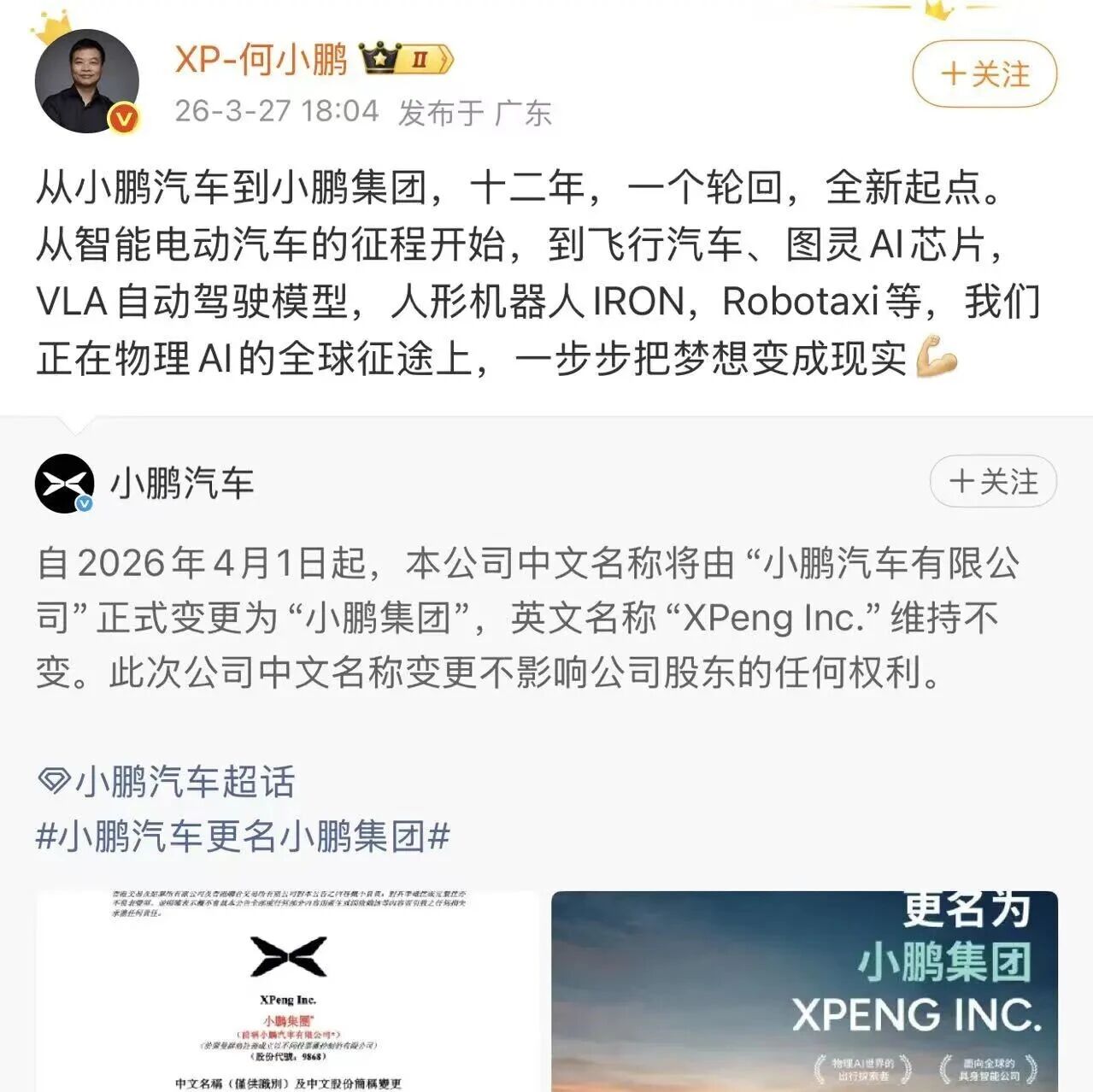 小鹏汽车改名,何小鹏称“在物理AI征途上把梦想变现实”