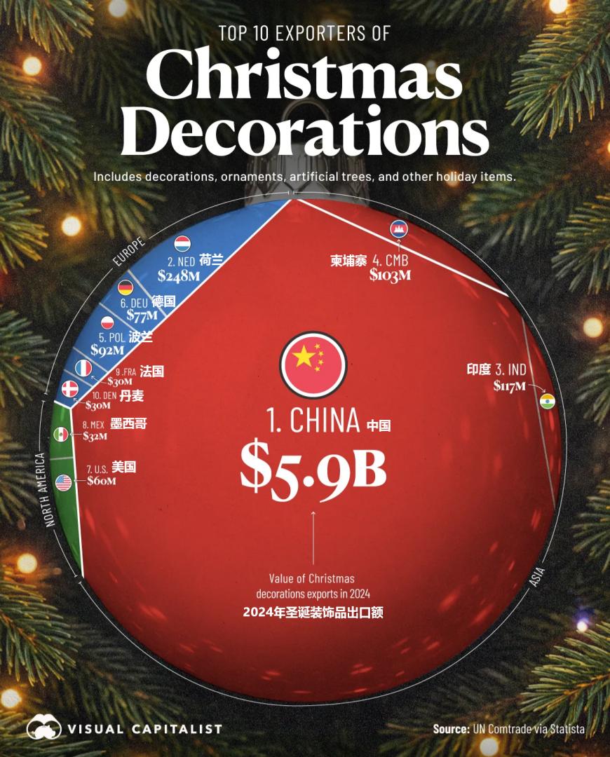 全球圣诞装饰品出口格局 - 中国是全球最大的圣诞装饰品出口国,2024年出口额高达约59亿美元 [1] - 荷兰位居第二,2024年出口额约为2.48亿美元,是欧洲重要的物流和转口枢纽 [1] - 印度和柬埔寨紧随其后,2024年出口额分别为1.17亿美元和1.03亿美元,对寻求供应链多元化的制造商吸引力增强 [1] - 德国、波兰、法国和丹麦也位列主要出口国之列 [1]
