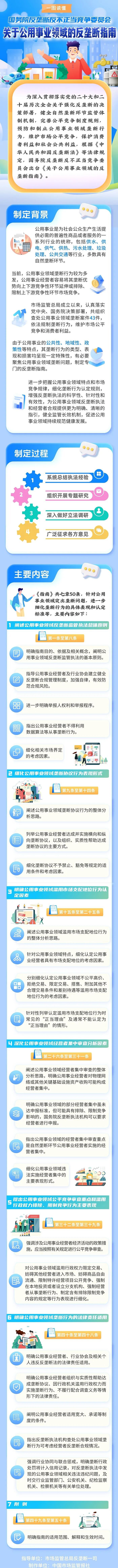 政策发布 - 国务院反垄断反不正当竞争委员会近日印发施行《关于公用事业领域的反垄断指南》[1][3] - 该指南旨在预防和制止公用事业领域垄断行为,维护市场公平竞争,保护消费者利益和社会公共利益[1] 制定背景与必要性 - 公用事业是为社会公众生产生活提供必需的普遍性商品或服务的行业统称,包括供水、供电、供气、供热、污水处理、垃圾处理、公共交通等行业,多数具有自然垄断环节[5] - 当前公用事业领域垄断行为较为多发,经营者容易将其垄断优势向上下游竞争性环节延伸或排除、限制竞争[6] - 市场监管总局成立以来,共组织查处公用事业领域垄断案件43件[6] - 由于公用事业的公共性、地域性、政策性等特点,其垄断行为具有特殊性,有必要制定专门指南以增强反垄断执法的科学性、针对性和有效性[7] 指南主要内容与结构 - 《指南》共七章50条,针对公用事业领域突出垄断问题,细化垄断行为的具体表现和认定标准[9] - 第一章至第八条阐述监管执法总体原则,明确指南目的、依据及相关概念,指导经营者及行业协会建立健全反垄断合规管理制度[9] - 第九条至第十四条细化公用事业领域垄断协议行为的表现形式,包括横向和纵向垄断协议,以及组织、实质性帮助达成垄断协议的主要方式[10] - 第十五条至第二十五条明确滥用市场支配地位行为的认定,细化认定经营者具有市场支配地位的考虑因素,并列举不公平高价、拒绝交易、限定交易、搭售、差别待遇等行为的认定因素[11][12][13] - 第二十六条至第三十一条深化经营者集中审查分析,明确对物理网络或关键基础设施资产的收购可能构成经营者集中,并指出未达申报标准但可能具有排除、限制竞争影响的集中也可被要求申报[14][15] - 第三十二条至第三十九条提出公平竞争审查重点和滥用行政权力排除、限制竞争行为的主要表现,强调涉及公用事业经营者的政策措施应进行公平竞争审查[16][17][18] - 第四十条至第四十八条明确公用事业领域垄断行为的法律责任适用,包括经营者、行业协会及相关个人违反反垄断法的责任[19][20][21]