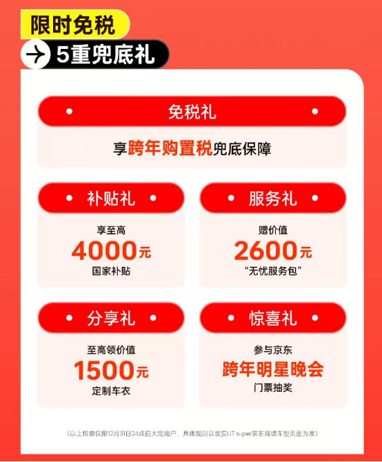 今年11月,广汽埃安、京东、宁德时代联合打造的埃安UT super 正式上市,该车型凭借4.99万元起的震 撼价格以及四大同级颠覆产品力,获得市场的高度关注,本周交付突破2000辆,已连续两周交付超1000 辆。随着年末购置税减免等政策进入倒计时,京东双 12 期间,埃安UT super推出"限时免税5重兜底"福 利和"9.9 元全民试驾"活动,助力消费者抓住购车末班车。综合估算12月31日前购车相比明年购车省超 过1万元,埃安UT super无疑是本次京东双12"又好又便宜"最值得选购的单品。埃安UT super此次推出 的"限时免税5重兜底"政策,主要面向12月31日24点前大定的用户。内容包括:因厂商生产、运输等非 用户原因导致车辆在2026年2月14日前完成开票交付,所产生的购置税差额由厂家补贴,享受跨年购置 税兜底保障;整车购买可享4000元补贴,电池租用模式购车可获2000元补贴;赠送价值约2600元的无忧 服务包,涵盖洗车、养护等项目;还提供最高1500元的定制车衣以及抽取京东跨年晚会门票的机会。活 动期间,购车用户还可参与最高49999元的现金返现活动。近期有购车计划用户可以通过京东APP申请 ...