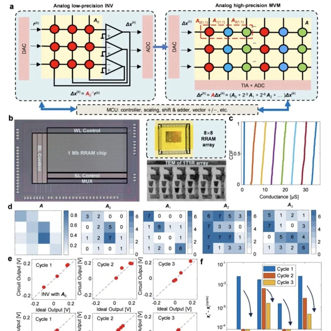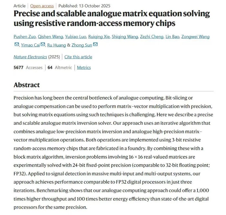 技术突破 - 成功研制出基于阻变存储器的高精度、可扩展模拟矩阵计算芯片 [1] - 首次实现了在精度上可与数字计算媲美的模拟计算系统 [1] - 将模拟计算的精度提升至24位定点精度 [1] 性能表现 - 在求解大规模MIMO信号检测等关键科学问题时,计算吞吐量与能效较当前顶级数字处理器提升百倍至千倍 [1] - 在求解32×32矩阵求逆问题时,其算力已超越高端GPU的单核性能 [2] - 当问题规模扩大至128×128时,计算吞吐量达到顶级数字处理器的1000倍以上 [2] - 相同精度下能效比传统数字处理器提升超100倍 [2] 技术细节 - 实验上成功实现16×16矩阵的24比特定点数精度求逆 [2] - 矩阵方程求解经过10次迭代后,相对误差可低至10⁻⁷量级 [2]
