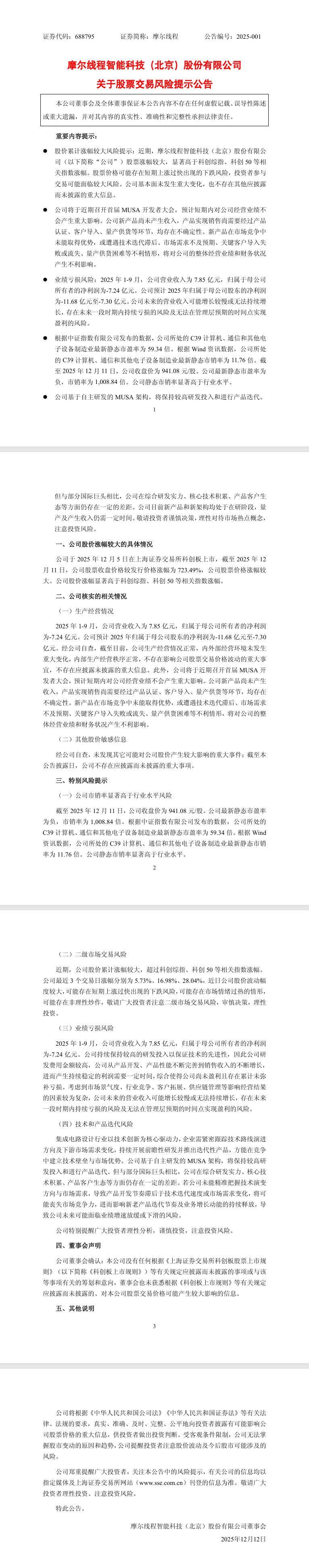 公司股价表现与市场定位 - 公司于12月5日在科创板上市,上市当天股价大涨425.46% [4] - 最近3个交易日(截至12月11日)涨幅分别为5.73%、16.98%、28.04% [4] - 12月11日股价大幅上涨28.04%,收于941.08元/股,市值达到4423亿元 [4] - 上市仅5个交易日,收盘价较114.28元的发行价涨幅达723.49% [4] - 截至12月11日,公司市值升至A股第27名,超过五粮液、恒瑞医药等知名公司 [4] - 公司最新收盘价941.08元/股,高居A股第三,仅次于贵州茅台和寒武纪 [4] 公司财务与经营状况 - 2025年1-9月,公司营业收入为7.85亿元,归属于母公司所有者的净利润为-7.24亿元 [1] - 公司预计2025年全年归属于母公司股东的净利润为-11.68亿元至-7.30亿元 [1] - 公司未来的营业收入可能增长较慢或无法持续增长,存在持续亏损及无法在预期时间点实现盈利的风险 [1] - 公司新产品尚未产生收入,产品实现销售需经过产品认证、客户导入、量产供货等环节,均存在不确定性 [1] - 公司新产品和新架构均处于在研阶段,量产及产生收入仍需一定时间 [2] 公司估值水平 - 截至2025年12月11日,公司最新静态市盈率为负,静态市销率为1008.84倍 [2] - 公司所处的计算机、通信和其他电子设备制造业最新静态市盈率为59.34倍,最新静态市销率为11.76倍 [2] - 公司静态市销率显著高于行业水平 [2] 公司业务与技术 - 公司基于自主研发的MUSA架构,将保持较高研发投入和进行产品迭代 [2] - 与部分国际巨头相比,公司在综合研发实力、核心技术积累、产品客户生态等方面仍存在一定差距 [2] - 公司将于近期召开首届MUSA开发者大会,但预计短期内对公司经营业绩不会产生重大影响 [1] 公司提示的风险因素 - 公司股票涨幅较大,显著高于科创综指、科创50等相关指数涨幅 [1] - 股票价格可能存在短期上涨过快出现的下跌风险 [1] - 新产品在市场竞争中可能未能取得优势,或遭遇技术迭代滞后、市场需求不及预期、关键客户导入失败或流失、量产供货困难等不利情形 [1]