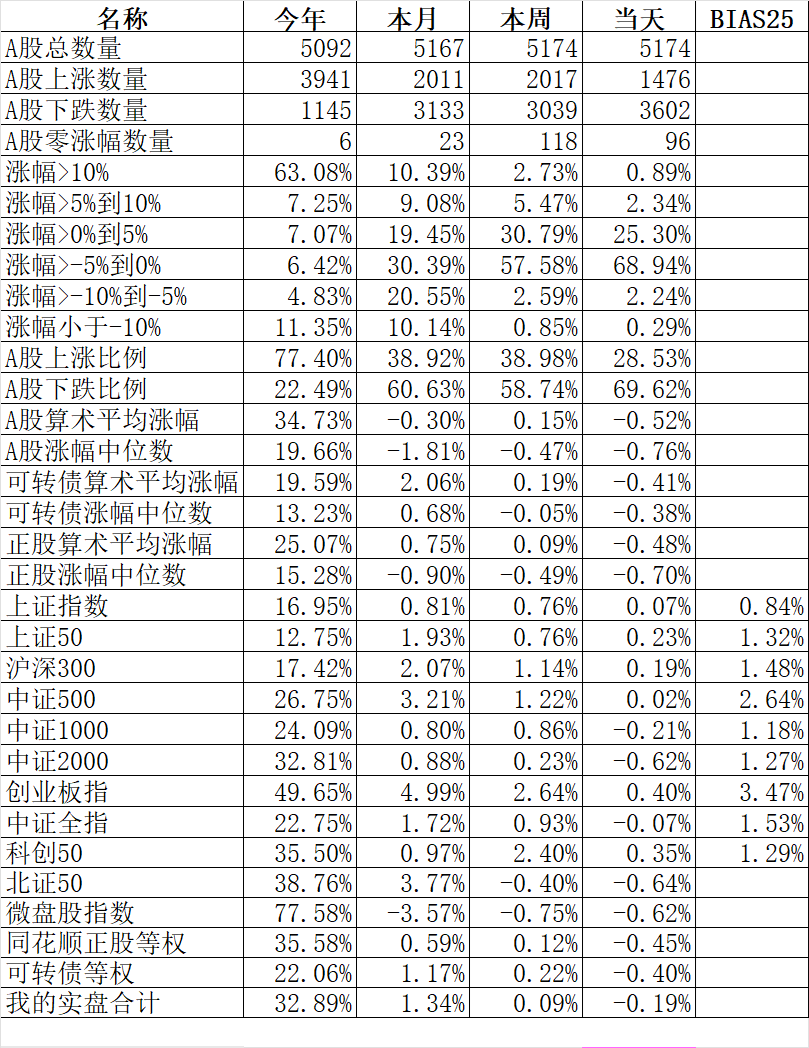 市场整体表现 - 当日A股市场呈现普跌格局,上涨个股1476只,下跌个股3602只,上涨比例仅为28.53%,下跌比例高达69.62% [1][10] - 市场整体赚钱效应差,个股涨幅中位数为-0.76%,算术平均涨幅为-0.52% [1][3][10][12] - 上证指数微涨0.07%,实现五连阳,但主要宽基指数涨跌互现,整体呈现“大强小弱”格局 [1][9][10] 主要宽基指数表现 - 大盘及蓝筹指数相对强势,上证50上涨0.23%,沪深300上涨0.19% [1][10] - 成长风格指数领涨,创业板指上涨0.40%,科创50上涨0.35% [1][10] - 小盘及微盘股指数表现疲软,中证2000下跌0.62%,微盘股指数下跌0.62%,北证50下跌0.64% [1][10] 行业板块表现 - 电力设备行业领涨,涨幅为1.12%,建筑材料与电子行业分别上涨0.88%和0.58% [2][11] - 社会服务行业领跌,跌幅达2.07%,美容护理和商贸零售行业分别下跌1.65%和1.60% [2][11] 个股极端表现 - 市场情绪分化,共有68只个股涨停,同时有16只个股跌停 [4][13] - 部分个股创出阶段新高,有122只个股盘中创一年新高,其中44只创出历史新高,包括紫金矿业、中际旭创、北方华创等 [4][13] - 部分个股表现低迷,有16只个股盘中创一年新低,其中退市苏吴创历史新低 [3][4][12][13] 可转债市场表现 - 可转债市场整体下跌,384只可转债算术平均下跌0.41%,其对应正股平均下跌0.48% [5][14] - 不同价格区间的可转债表现分化,价格低于110元的可转债正股平均跌幅最大,为-1.18%,但其转债跌幅相对较小,为-0.31%,显示出较高的转股溢价率保护,该区间平均转股溢价率达97.63% [5][14] - 主仓持有的20只可转债表现优于市场整体,平均下跌0.20%,其对应正股平均下跌0.17% [5][14] 年度牛股与基金表现 - 年内出现两只“十倍股”,上纬新材年内上涨1451.43%,天普股份年内上涨1102.24% [6][15] - 永赢科技智选基金自2023年10月30日成立以来,截至昨日净值上涨231.72% [6][15] - 但分析认为,上述牛股和基金在过去几年表现平淡或无历史记录,在年初时点难以被选中并重仓持有,且根据历史规律,其下一年度表现大概率回归平庸 [6][7][15][16]