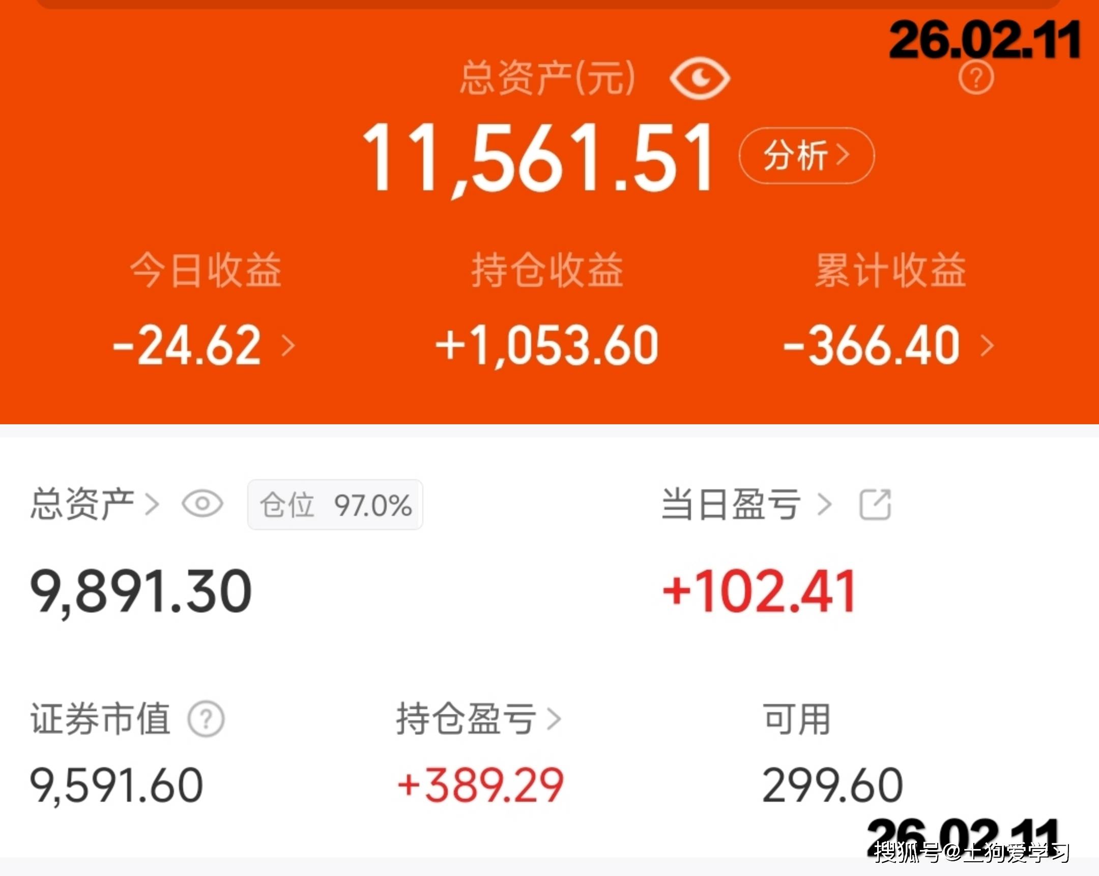 26.02.11 基金盈收78元~ 场内买入140元;场内卖出210元。 场内盈收102元;场外亏损24元。 " 不求涨停只求不停涨 " 场内 今日盈亏金额 +102.41 2m=0.2ml1 9,591.60 +389.29 场外 星期三 日收益 -24.62 2026-02-11 (历史收益 > 搜狐号@土狗爱学习 ...