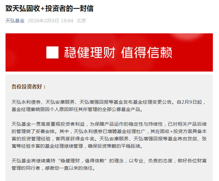 基金经理变动 - 天弘基金宣布基金经理姜晓丽因个人原因卸任其管理的全部公募基金产品 [1] - 姜晓丽离职主要源于希望阶段性休整并更多兼顾家庭的个人选择,自2009年工作以来从未休过长假 [4] - 姜晓丽拥有16年证券从业经验,曾在天弘基金担任研究员、交易员及部门总经理等职 [4] 管理规模与影响 - 截至离任时,姜晓丽共管理10只基金,合计规模达到350亿元 [4] - 天弘基金表示其“固收+”业务采用多基金经理共管模式,公司具备完备的投研体系和人才储备以保障产品持续稳健运作 [4][5] - 接任基金经理将继续执行既定投资目标与流程,投资范围无重大变化,投研团队将提供全面支持 [5]