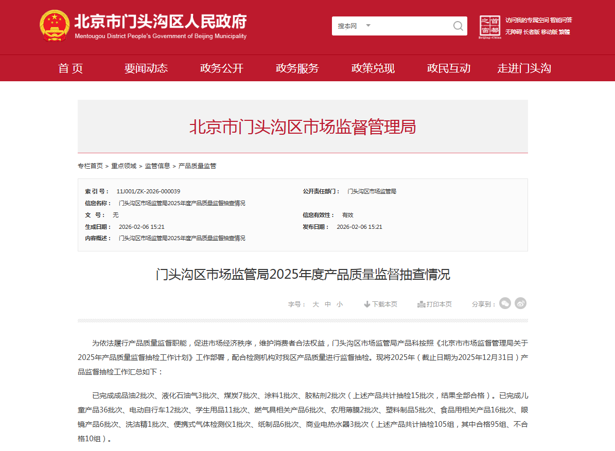 北京市门头沟区市场监管局发布2025年度产品质量监督抽查情况