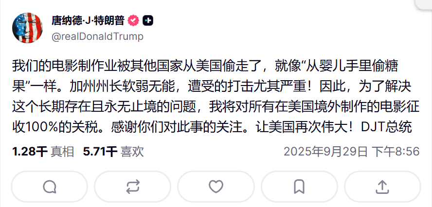 对境外制作电影征100%关税!特朗普又发出了关税威胁
