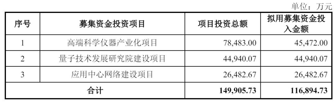 国仪量子技术(合肥)股份有限公司(简称:"国仪量子")日前递交招股书,准备在科创板上市。 | 序号 | 募集资金投资项目 | 项目投资总额 | 拟用募集资金投 入金额 | | --- | --- | --- | --- | | | 高端科学仪器产业化项目 | 78,483.00 | 45,472.00 | | 2 | 量子技术发展研究院建设项目 | 44.940.07 | 44,940.07 | | 3 | 应用中心网络建设项目 | 26,482.67 | 26.482.67 | | | 合计 | 149,905.73 | 116,894.73 | 国仪量子计划募资11.7亿元,其中,4.55亿元用于高端科学仪器产业化项目,4.5亿元用于量子技术发展研究院建设项目,2.65亿元用于应用中心网络建设 项目。 上半年营收1.7亿,净亏7578万 国仪量子的核心技术是以量子精密测量为代表的先进测量技术,为全球范围内企业、政府、研究机构提供以增强型量子传感器为代表的核心关键器件、用 于分析测试的科学仪器装备、赋能行业应用的核心技术解决方案等优质的产品和服务。 国仪量子2022年、2023年、2024年营收分别为1.5 ...