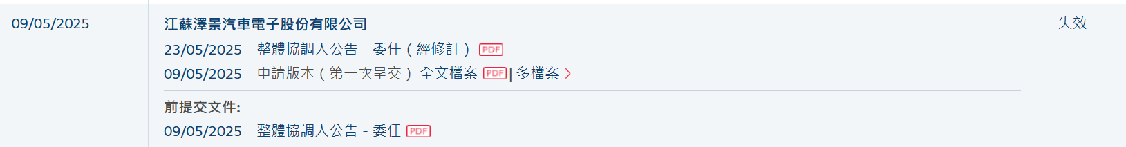 据此前招股书披露,泽景电子是中国创新智能座舱视觉、交互解决方案的先行者和领军者,提供以公司的挡风玻璃HUD(简称"W-HUD")解决方案CyberLens 及增强现实HUD(简称"AR-HUD")解决方案CyberVision为主,以测试解决方案和其他创新视觉技术解决方案为辅的综合解决方案。 | 09/05/2025 | 江蘇澤景汽車電子股份有限公司 | | --- | --- | | | 23/05/2025 整體協調人公告 - 委任(經修訂) | | | 09/05/2025 申請版本(第一次呈交) 全文檔案 [四]多檔案》 | | | 前提交文件: | | | 09/05/2025 整體協調人公告 - 委任 四F | 江苏泽景汽车电子股份有限公司(简称:泽景电子)于5月9日递交的港股招股书满6个月,于11月9日失效,海通国际、中信证券为其联席保荐人。 ...
