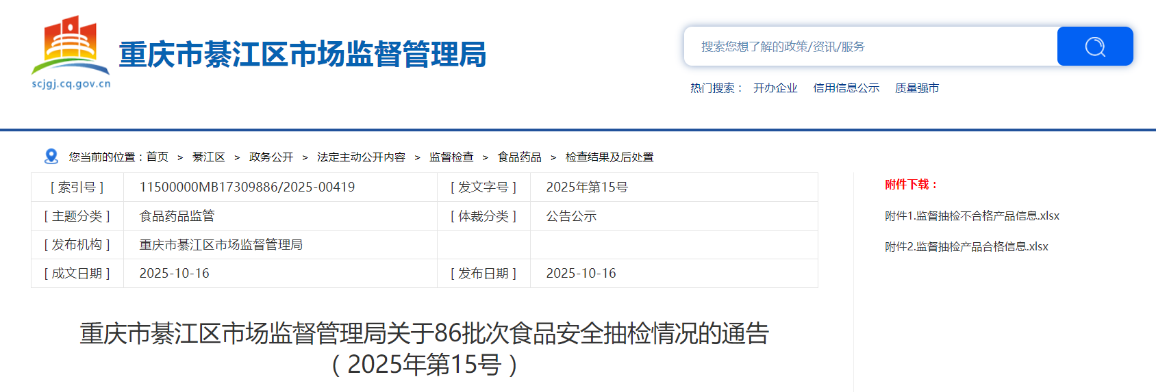 重庆市綦江区市场监督管理局关于86批次食品安全抽检情况的通告(2025年第15号)