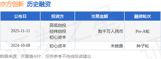 证券之星消息,根据天眼查APP于11月11日公布的信息整理,杭州亦方智能科技有限公司Pre-A轮融 资,融资额数千万人民币,参与投资的机构包括高瓴创投,经纬创投,初心资本。 数据来源:天眼查APP 以上内容为证券之星据公开信息整理,由AI算法生成(网信算备310104345710301240019号),不构成 投资建议。 | 公布日 | 投资方 | 交易金额 | 融资轮次 | | --- | --- | --- | --- | | | 高瓴创投 | | | | 2025-11-11 | 经纬创投 | 数千万人民币 | Pre-A轮 | | | 初心资本 | | | | 2024-10-08 | 初心资本 | 未披露 | 种子轮 | 亦方创新(Vastnaut)2024年成立于深圳,核心团队汇聚了来自智能硬件、算法、供应链等领域的资深 专家。公司凭借在动力系统、电机与结构技术上的深厚积累,通过自研的AI仿生算法让外骨骼能够实 时感知用户意图与环境变化,提供精准、自然的助力,同时搭配行业领先的自研电机系统与新型轻量化 材料,在保证专业可靠的支撑强度的同时,极大提升了穿戴舒适性与运动灵活性。 ...