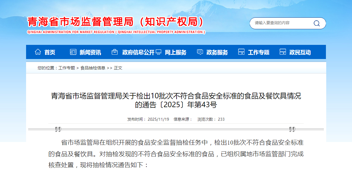 青海省市场监督管理局关于检出10批次不符合食品安全标准的食品及餐饮具情况的通告〔2025〕年第43号