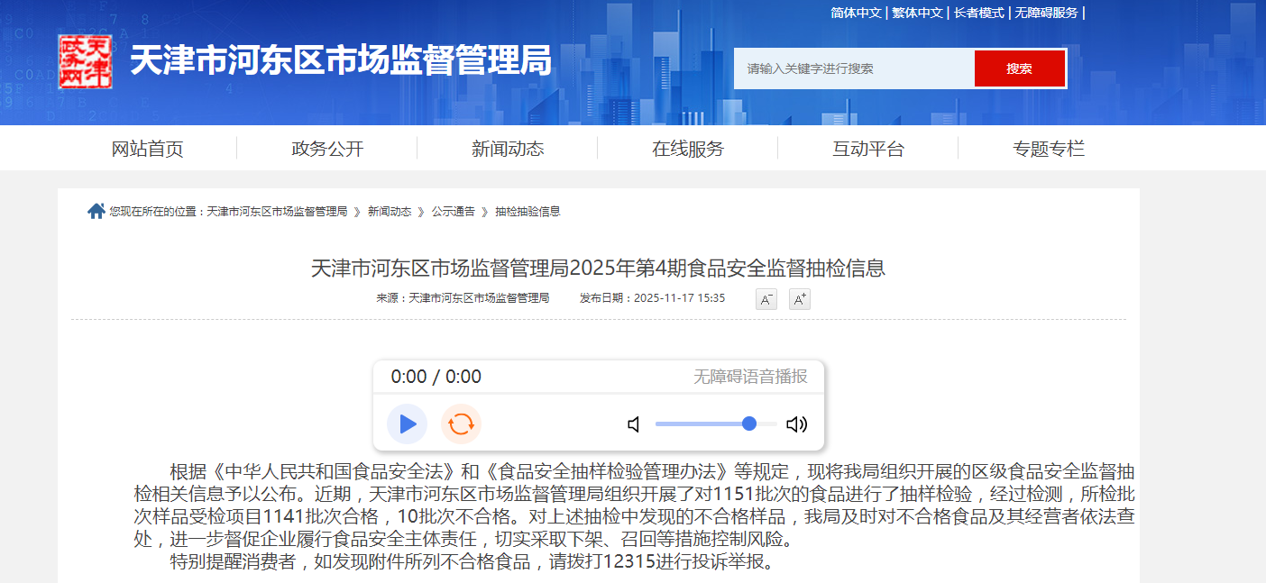 天津市河东区市场监督管理局2025年第4期食品安全监督抽检信息