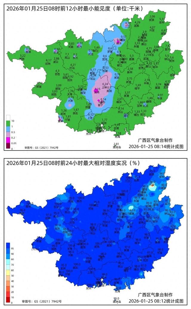 广西卫视2026-01-25 12:22:47 预计未来三天 广西天空云量较多 阴雨的身影将在部分地区出现 其中今晚到26日白天 桂北、桂西 将有一波小雨、局地中雨 26日晚上到27日白天 阴雨主要影响桂北 2026年01月25日08时前12小时最小能见度(单位:千米) 10 0.5 0.2 广西区气象台制作 0.05 2026-01-25 08:14统计成图 审團号:GS (2021) 7942号 0 18 @ 2026年01月25日08时前24小时最大相对湿度实况(%) 05 90 80 70 60 50 40 30 20 广西区气象台制作 10 99.0 2026-01-25 08:12统计成图 审图号: GS (2021) 7942号 0 除此之外 广西的天气舞台上 还将有能见度不足1000米的雾 和回南潮湿天气的身影 其中今天晚上到明天白天 雾主要影响桂南、桂西部分地区 回南潮湿天气影响桂南 25日晚上到27日白天 桂南部分地区将持续 有雾和回南潮湿天气 提醒上述地区的朋友 提前紧闭门窗阻隔水汽入侵室内 不过在使用煤炭和液化气时 务必注意加强室内通风 谨防一氧化碳中毒 司机朋友行车 遇到低能见度天气 ...