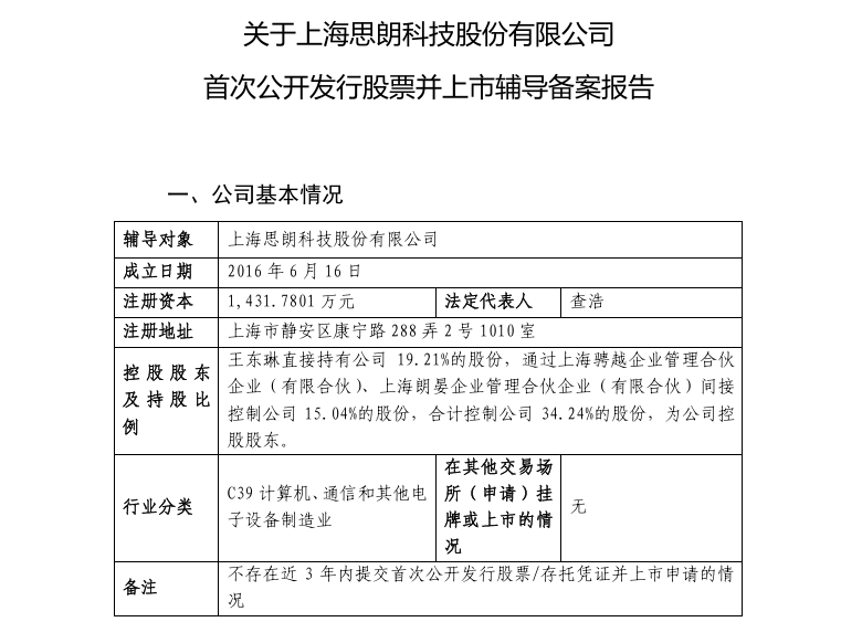 公司概况与股权结构 - 公司全称为上海思朗科技股份有限公司,成立于2016年6月16日,注册资本为1,431.7801万元,注册地址位于上海市静安区 [1] - 公司属于计算机、通信和其他电子设备制造业,是一家致力于国产自主处理器内核研发、芯片设计和应用的高科技半导体企业 [1] - 公司控股股东、创始人王东琳直接持有公司19.21%的股份,并通过两家有限合伙企业间接控制15.04%的股份,合计控制公司34.24%的股份 [1][7] - 公司已完成多轮融资,前十大股东包括上海联和投资有限公司(持股9.8518%)、湖州景创股权投资合伙企业(有限合伙)(持股5.9683%)、福建时代泽远股权投资基金合伙企业(有限合伙)(持股5.256%)、北京集创北方科技股份有限公司(持股3.6498%)等 [7][8] 核心技术:MaPU架构 - 公司拥有自研的万亿次代数运算微处理器MaPU的完整自主知识产权,其架构基于“软件定义硬件”理念,是可重构芯片架构设计 [1] - MaPU架构融合了ASIC的高效性、FPGA的可编程性以及CPU的灵活性优势,是通用计算架构领域的一次创新发明 [2] 产品与商业化进展 - 公司于2021年9月正式发布采用MaPU架构的5G小基站UCP系列芯片,包括UCP1002和UCP4008 [2] - UCP1002是中国自主内核的5G小基站处理器芯片,已实现量产;UCP4008主要面向企业级应用场景,是国内企业级5G小基站芯片 [2] - 2023年初,公司实现首个数亿级商业订单落地并完成交付 [2] - UCP4008芯片已被中国移动研究院、新华三、长焜科技、共进电子和金信诺等多家国内小基站行业头部企业应用于扩展型皮基站、一体化站和家庭站等多款商用产品中 [2] - 2024年9月,公司发布面向移动通信小基站和卫星互联网的新一代产品“信芯”UCP8016,该产品具备八天线处理能力(8T8R),算力达100TOPS [3] - 在公网领域,公司UCP系列芯片已得到三大运营商以及大唐移动、长焜科技、星网锐捷、新华三、联想等企业的认可 [3] - 在专网领域,UCP系列芯片正同时服务于国内两大低轨卫星互联网星座,参与了G60星座地面设备研制 [3] 新业务拓展:科学计算机 - 公司于2025年企业家博鳌论坛期间,首次公开发布基于自研MaPU架构研制的“天穹”3D科学计算机产品 [3] - 该产品在面向药物研发的科学计算方面有巨大优势,基于“天穹”研制的多款新药已进入计算试验阶段并取得阶段性重大突破 [3] - “天穹”的应用边界将逐步扩展至量子化学、人工智能模型训练等多个科研领域 [3] 核心团队背景 - 公司核心技术团队由博士、博士后组成 [4] - 创始人王东琳曾任中科院自动化所所长、国家专用集成电路设计工程技术研究中心主任,主导过7款密集计算处理器的研发,获国家科技进步二等奖、国防科学技术一等奖 [4] - 董事长兼CEO查浩于2019年底加入公司,此前曾在远东宏信、毕马威就职,并担任远翼投资的合伙人,管理数十亿规模基金 [5] 融资历程与投资方 - 公司已完成9轮融资,其中天使轮融资额为2亿人民币,B轮融资额为3亿人民币,C轮融资额达1亿美元 [5] - 2024年2月,公司完成D轮融资交割,由宁德时代旗下产业投资平台溥泉资本领投,中芯聚源跟投 [5] - 2022年2月,公司完成规模达1亿美元的C轮融资,投资方包括天风天睿、中金资本以及产业链战略投资方集创北方,老股东远翼投资持续追加投资 [6] - 2022年末,公司完成C+轮融资,由央视融媒体产业投资基金独家投资 [6] - 2024年Pre-D轮融资中,新进股东包括茅台科创(北京)投资基金合伙企业、茅台金石(贵州)产业发展基金合伙企业、安徽交控金石股权投资基金合伙企业等多家国有资本 [6] - 茅台科创基金由茅台集团和茅台私募基金管理有限公司共同出资设立,专注于高科技领域投资 [6] - 茅台金石基金由贵州茅台酒股份有限公司与中信金石投资有限公司等共同发起设立,投资策略聚焦于新一代信息技术、生物技术等战略性新兴产业 [7]