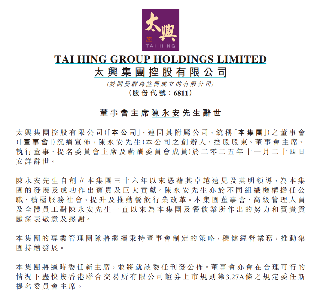 公司核心事件 - 太兴集团控股有限公司创办人、控股股东兼董事会主席陈永安于11月24日安详辞世,享年66岁 [1] - 公司官方网站主页已变为黑白页面,并显示沉重哀悼的讣告内容 [4] - 讣告表示将坚守陈永安的理念与使命,继续砥砺前行 [6] 创始人背景与贡献 - 陈永安自创立集团36年以来,为集团的发展及成功作出宝贵及巨大贡献 [4] - 陈永安于餐饮行业拥有逾30年经验,积极以多元品牌策略扩展业务 [6] - 陈永安于2020年获香港特别行政区政府委任为太平绅士,曾任香港餐饮联业协会会长等多个行业公职 [6] 公司发展历程与规模 - 公司于1989年在香港西湾河以“太兴”品牌开设首间餐厅 [6] - 公司已由一间港式烧味快餐店,发展为香港最大的自营休闲餐饮集团 [6] - 公司建立了坐拥超过200间餐厅的庞大网络,分店遍布香港、中国内地及澳门 [6] 公司品牌组合 - 除旗舰品牌“太兴”外,集团通过自创、收购及授权成功壮大品牌组合 [7] - 品牌组合包括“敏华冰厅”、“茶木”、“亚参鸡饭”、“靠得住”、“锦丽”等超过15个品牌 [7] 管理层继任安排 - 公司宣布陈永安之子、集团公司执行董事陈家强接任为董事会主席、提名委员会主席及薪酬委员会成员,即日起生效 [7] - 陈永安堂妹、公司执行董事陈淑芳获委任为董事会副主席 [7] - 陈家强于2009年加入集团,并于2025年7月晋升为执行董事,主要负责统筹品牌规划、产品推广及业务数码化等 [7]