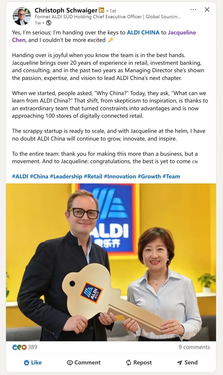 10月10日「零售商业财经」获悉,奥乐齐中国的管理层变动落定:原首席执行官Christoph Schwaiger卸任,现任奥乐齐中国董事总经理的陈佳正式接棒 CEO,直接向全球总部汇报;与此同时,中国区主席陈有钢将在年底荣休。 图源:领英 这场人事更迭发生在硬折扣赛道最拥挤的时刻,超盒算NB(原盒马NB)门店数已近300家,美团"快乐猴"、京东折扣超市等新玩家正加速入场,而奥乐 齐入华6年,截至目前门店数量仅79家。 百年零售巨头的中国故事,从来不是简单的模式复制。如今陈佳掌舵,她所面临的,不仅是如何让奥乐齐跑快点,更是如何让这家德国企业真正融入中国 市场的消费脉络,而这,亦成为行业当下最关注的话题之一。 换帅不是偶然,"慢半拍"的奥乐齐需要"快跑" 奥乐齐的管理层调整,某种程度上是被行业节奏和自身瓶颈推着走的结果。 从2019年在上海开出首店起,Schwaiger带领团队完成了德国硬折扣模式的初步落地。据中国连锁经营协会(CCFA)数据,其单店年销约3600万元,在千 平米级零售店铺中表现亮眼,这一成绩也证明了模式的可行性。但他的战略相对稳健,6年时间始终扎根上海,2024年门店总数停留在55家。 | 序号 ...
