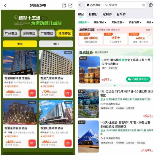 为了满足用户在全运会期间的观赛需求,同程旅行近日上线"好房配好赛"酒店专题活动页,覆盖广东及 港澳赛区。其中,广东赛区的部分赛场周边酒店低至4折起。 此外,王楚钦、孙颖莎于11月10日在澳门银河综艺馆,参加的男子和女子单打1/16决赛,也吸引众多乒 乓球迷到场支持。同程旅行数据显示,11月10日当天,澳门特别行政区酒店预订热度同比增长超过 52%。 11月10日是第十五届全国运动会正式开幕后的首个比赛日,孙杨与潘展乐在男子400米自由泳决赛的顶 峰相会,王楚钦、孙颖莎亮相男子和女子单打1/16决赛等"焦点赛事"拉动场馆周边酒店预订热度高涨。 11月10日晚19点,男子400米自由泳决赛将在深圳大运中心角逐金牌。同程旅行数据显示,截至11月10 日中午,当天入住的深圳大运中心周边5公里范围内的部分酒店热门房型,已经售罄。此外,11月10日 当天,深圳大运中心所在地——深圳市龙岗区的酒店预订热度月环比增长超过24%。 此外,全运会比赛期间,在同程旅行APP上搜索"全运会",还可以选购包含住宿、景点以及赛场门票的 观赛套餐。同程旅行相关负责人表示,由于全运会的赛事门票预订火爆,部分观赛套餐库存紧张,提醒 有"观赛+ ...