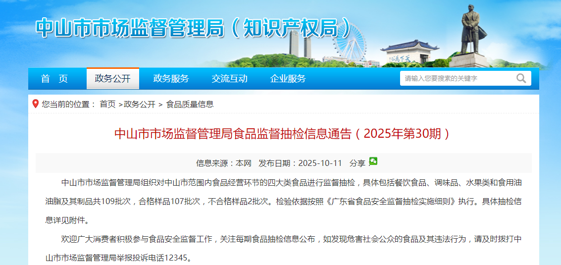 广东省中山市市场监督管理局食品监督抽检信息通告(2025年第30期)