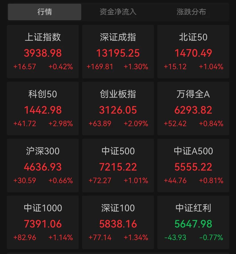 10月24日早间,A股主要指数强势拉升,沪指盘中突破前期高点,再创今年以来新高。截至午间收盘, 上证指数涨0.42%,报3938.98点;深证成指涨1.3%,报13195.25点;创业板指涨2.09%,报3126.05点。 沪深两市半日成交额1.23万亿元,成交量显著放大。 | 行情 | 资金净流入 | 涨跌分布 | | --- | --- | --- | | 上证指数 | 深证成指 | 北证50 | | 3938.98 | 13195.25 | 1470.49 | | | +16.57 +0.42% +169.81 +1.30% +15.12 +1.04% | | | 科创50 | 创业板指 | 万得全A | | 1442.98 | 3126.05 | 6293.82 | | | +41.72 +2.98% +63.89 +2.09% +52.42 +0.84% | | | 沪深300 | 中证500 | 中证A500 | | 4636.93 | 7215.22 | 5555.22 | | | +30.59 +0.66% +72.27 +1.01% +44.76 +0.81% | | | 中证1000 | ...