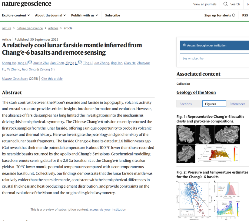 10月6日,在中华民族传统佳节中秋节之际,国家航天局和国家原子能机构联合发布嫦娥六号月球背面样品研究最新 成果。中国科学家首次基于嫦娥六号月球背面样品研究发现,月球背面月幔相比月球正面更"冷",这一发现进一步 深化了人类对月球"二分性"现象的认识,为月球正面与月球背面的月幔温度差异提供了岩石学与地球化学等科学依 据,为月球演化和"二分性"特征研究提供了关键科学数据。 该研究结果由中核集团核工业北京地质研究院、北京大学、山东大学合作完成,已刊发于国际顶级学术期刊《自然· 地球科学》(Nature Geoscience)官网。 月球就像一本记录太阳系历史的书籍,而月幔是这本书中的"核心章节"。月幔位于月壳之下,是月球体积最大的组 成部分,月球古老的火山活动正是由月幔物质上涌形成的。因此,月幔等月球内部特征对于月球演化研究至关重 要。 在研究中,科学家利用可"侦探"的多种手段,对我国嫦娥六号从月球背面带回的玄武岩样品进行了精细分析。这些 样本的化学成分如同一个"黑匣子",记录了其形成时的深部温度压力等信息。科学家通过对月壤玄武岩样品中典型 单斜辉石、斜长石等矿物的成分分析,运用"单斜辉石单矿物温压计""单斜辉石-熔 ...