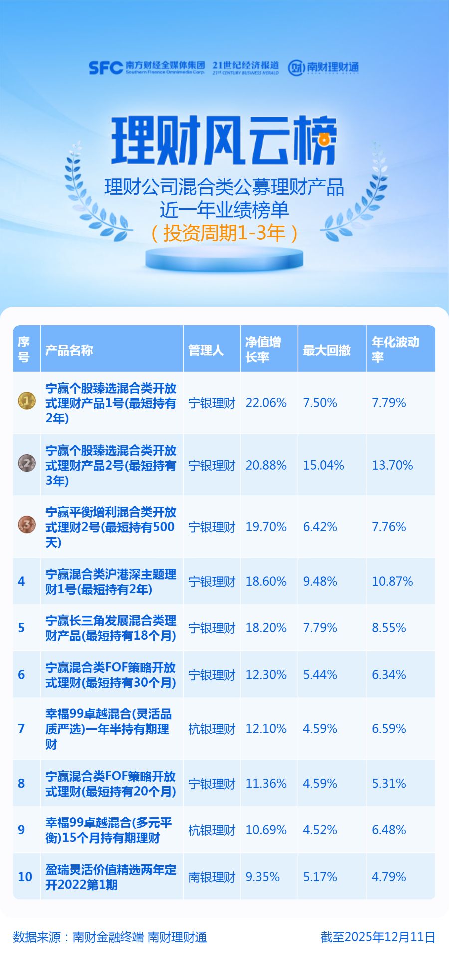 集团 21世纪经济报道 公司混合类公募期财 近一年业绩榜单 ( 投资間期1-3年 | 10 मुव | 产品名称 | 净值增 官出人 长率 | 最大回撤 | 年化波动 网 | | --- | --- | --- | --- | --- | | | 宁赢个股臻选混合类开放 | 式理财产品1号(最短持有 宁银理财 22.06% 7.50% | | 7.79% | | | 2年) | | | | | | 宁赢个股臻选混合类开放 式理财产品2号(最短持有 3年) | 宁银理财 20.88% | 15.04% | 13.70% | | | 宁赢平衡增利混合类开放 式理财2号(含短信有500 | 宁银理财 19.70% | 6.42% | 7.76% | | | R | | | | | 4 | 出當市出席者所有意圖 | 宁银理财 18.60% | 9.48% | 10.87% | | | 财1号(最短持有2年) | | | | | 5 | 宁赢长三角发展混合类理 | 宁银理财 18.20% 7.79% | | 8.55% | | | 财产品(最短接有18个月) | | | | 宁银理财"宁赢个股臻选混合类开放式理财产品2 ...