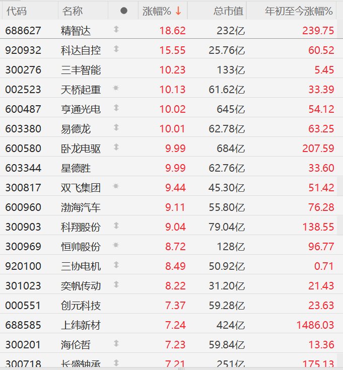 格隆汇12月22日|A股机器人概念全线上涨,精智达涨超18%,科达自控涨超15%,三丰智能涨超 10%,天桥起重、亨通光电、易德龙、卧龙电驱、星德胜10CM涨停,双飞集团、渤海汽车、科翔股份 涨超9%,恒帅股份、三协电机、奕帆传动涨超8%,创元科技、上纬新材、海伦哲、长盛铀承涨超7%。 消息面上,王力宏演唱会上宇树机器人的后空翻视频周末刷屏,马斯克转发该视频并留言:印象深刻。 摩尔士丹利的《2026年展望:人形机器人地平线》报告,让机器人板块周末讨论热度持续,报告指出 2026年初多个催化剂将推动热潮,包括特斯拉Optimus Gen 3发布、美国潜在的支持政策、技术突破以 及科技巨头的入场。另外,优必选再中标近6000万元大湾区数采项目,中标产品全部为优必选工业人形 机器人Walker S2,2025年人形机器人年度订单已近14亿。 MACD金叉信号形成,这些股涨势不错! | 代码 | 名称 | | 涨幅% ↓ | 总市值 | 年初至今涨幅% | | --- | --- | --- | --- | --- | --- | | 688627 | 精智达 | 1 | 18.62 | 232亿 | 239.75 ...