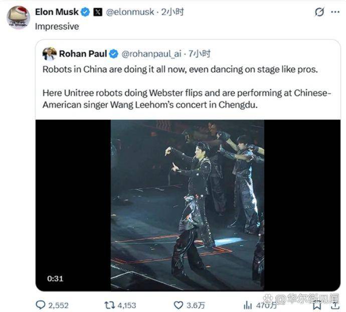 【马斯克转发宇树机器人伴舞视频:印象深刻】12月18日,王力宏成都演唱会首次引入宇树科技G1人 形机器人伴舞,共同演绎《火力全开》,实现了全球首个演唱会机器人舞台。6名机器人身着银色亮片 服装,精准卡点音乐节奏,动作与王力宏及其伴舞高度同步。最后表演以机器人一齐完成高难度"韦伯 斯特"空翻结尾,燃炸全场。视频在网上发布后,引发海内外的关注,马斯克看到了相关内容,并转发 留言称"Impressive"(令人印象深刻)。 ...