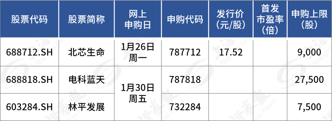 下周新股申购安排 - 下周共有3只新股申购,包括2只科创板新股和1只沪市主板新股 [1][7] - 科创板新股北芯生命将于周一(1月26日)申购,沪市主板新股林平发展和科创板新股电科蓝天将于周五(1月30日)申购 [1][7] 北芯生命 (科创板) - 公司是国内领先的心血管精准诊疗创新医疗器械企业,专注于心血管疾病精准诊疗创新医疗器械的研发、生产与销售 [2][8] - 发行价为每股17.52元,公开发行股票数量为5700万股,网上发行申购上限为9000股,顶格申购需配沪市市值9万元 [2][8] - 公司以科创板第五套标准申请上市 [2][8] - 2022年至2024年,公司营业收入分别为0.92亿元、1.84亿元、3.17亿元,净利润分别为-2.90亿元、-1.40亿元、-0.44亿元 [3][9] - 公司管理层初步预测,2025年营收为5.2亿元至5.6亿元,同比增长64.24%至76.88%,净利润为7800万元至8800万元,同比增长278.91%至301.85% [3][9] 林平发展 (沪市主板) - 公司是国内领先的循环造纸生产商,主要从事包装用瓦楞纸、箱板纸产品的研发、生产和销售,是一家集废纸利用、热电联产、绿色造纸于一体的资源综合利用企业 [4][10] - 公开发行股票数量为1885.37万股,网上发行申购上限为7500股,顶格申购需配沪市市值7.5万元 [4][10] - 公司与合兴包装、建发股份、厦门国贸、山鹰国际、龙利得等国内知名企业建立了稳定的合作关系 [4][10] - 2022年至2024年,公司营业收入分别为28.79亿元、28亿元、24.85亿元,净利润分别为1.54亿元、2.12亿元、1.53亿元 [4][10] - 公司管理层初步预测,2025年营收同比增长6.23%至11.87%,净利润同比增长17.76%至30.84% [4][10] 电科蓝天 (科创板) - 公司是国内宇航电源的核心供应商,主要从事电能源产品及系统的研发、生产、销售及服务,拥有发电、储能、控制和系统集成全套解决方案 [5][11] - 产品应用领域广泛,从深海(水下1公里)覆盖至深空(距地球2.25亿公里) [5][11] - 主营业务涵盖宇航电源、特种电源、新能源应用及服务三大板块 [5][11] - 公开发行股票数量为17370万股,网上发行申购上限为27500股,顶格申购需配沪市市值27.5万元 [5][11] - 公司为神舟系列飞船、天舟系列飞船、空间站“天和”核心舱、“问天”/“梦天”实验舱、北斗导航系统、嫦娥系列探月卫星、探火工程等多个国家级重点工程提供电源产品,2024年国内宇航电源产品市场覆盖率达到50%以上 [5][6][11] - 宇航电源产品主要包括空间太阳电池阵、空间锂离子电池组和电源控制设备及其构成的电源系统 [6][12] - 特种电源产品体系主要为特种锂离子电池组和燃料电池,应用于携行装备、特种车辆、特种无人机和工业机器人 [6][12] - 公司积极布局民品市场,开拓光伏、储能两大市场 [6][12] - 2022年至2024年,公司营业收入分别为25.21亿元、35.24亿元、31.27亿元,净利润分别为2.08亿元、1.9亿元、3.37亿元 [6][12] - 公司管理层初步预测,2025年营业收入同比增长0.35%至9.85%,净利润同比变动-3.18%至6.81% [6][12]