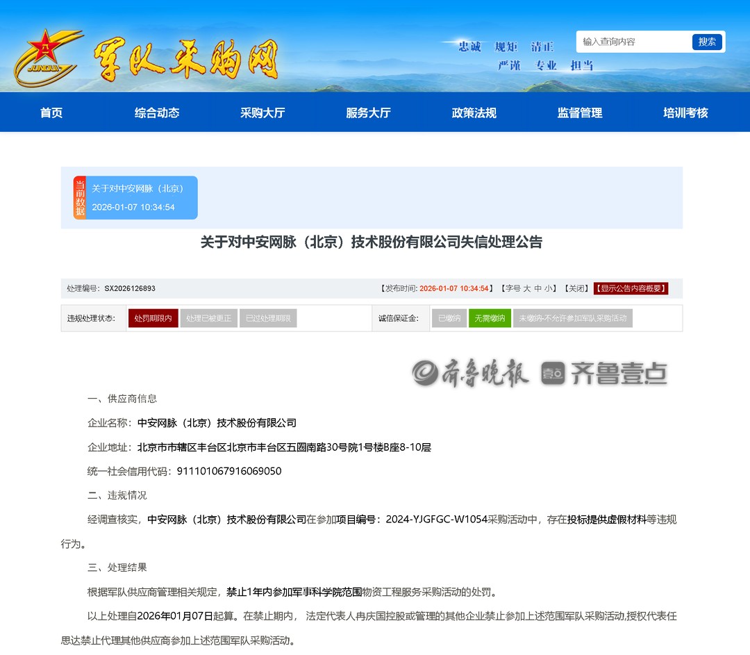 中安网脉因虚假材料问题被军采禁入1年