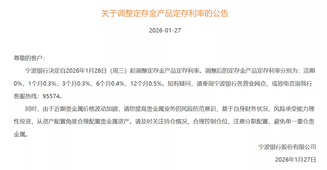 1月27日,宁波银行发布公告称,该行决定自2026年1月28日(周三)起调整定存金产品定存利率。调整后的定存金产品定存利率分别为:活期0%,1个月 0.3%,3个月0.3%,6个月0.4%,12个月0.5%。 同时,由于近期贵金属价格波动加剧,请客户提高贵金属业务的风险防范意识,基于自身财务状况、风险承受能力理性投资,从资产配置角度合理配置贵 金属资产。请及时关注持仓情况,合理控制仓位,注意分散配置,避免单一重仓贵金属。 (宁波银行) ...