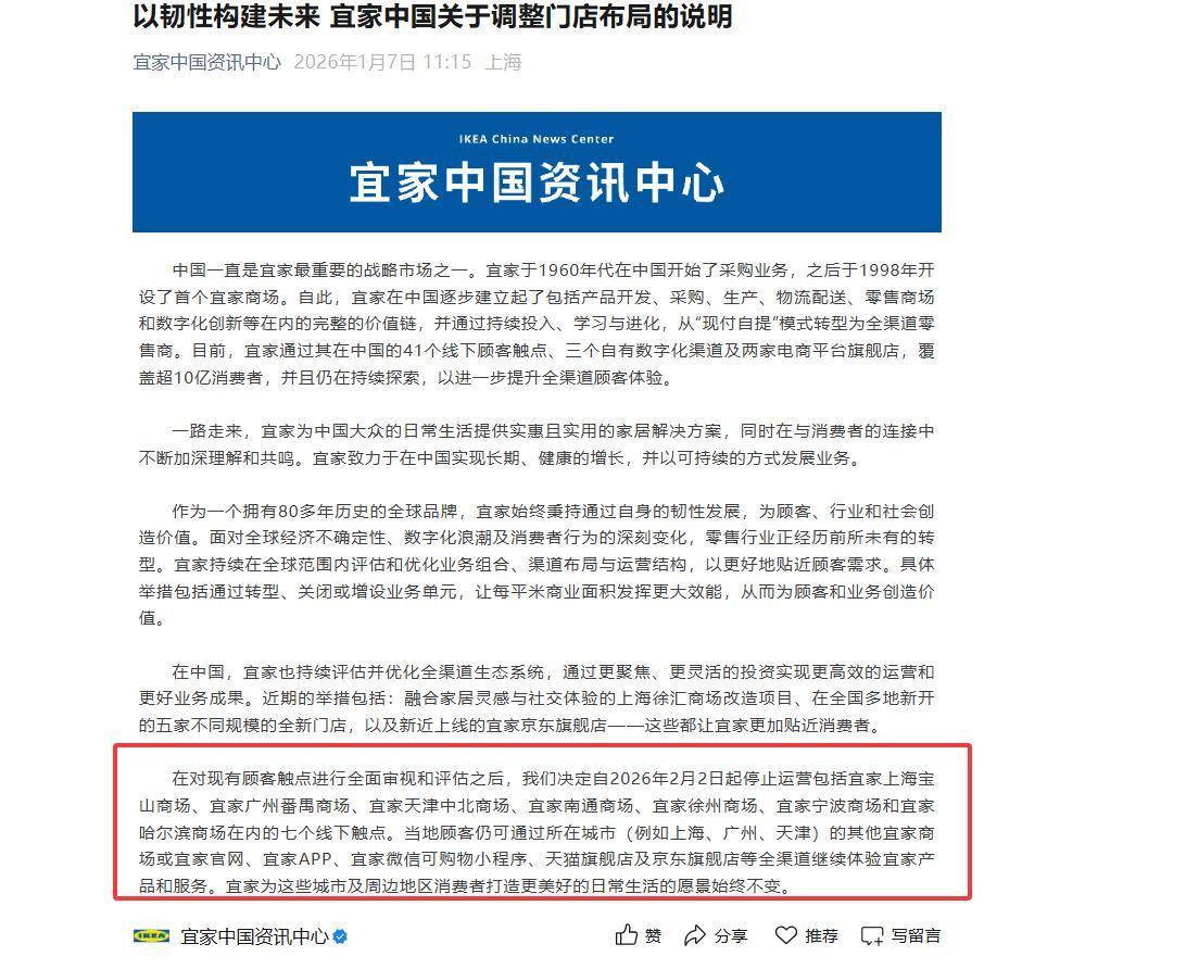 入华以来最大规模闭店 "像是一个时代结束了。"宜家官宣将关闭7家门店当天,社交媒体平台一阵唏嘘。 1月7日中午,"宜家中国资讯中心"账号发文称,自2026年2月2日起,宜家将停止运营包括上海宝山商场、广州番禺商场、天津中北商场、南通商场、徐州 商场、宁波商场、哈尔滨商场在内的7个线下触点。 "当地顾客仍可通过所在城市的其他宜家商场、宜家官网、App、微信小程序、天猫京东旗舰店等全渠道继续体验宜家产品和服务。"公司方面表示。 这是宜家自1998年进入中国市场以来,最大规模的一次闭店。 宜家方面给出的数据显示,截至目前,其在中国运营的线下触点累计为41个。此番关闭7家,相当于一口气关了1/6。 对于大规模闭店,宜家方面否认了"将大规模撤离中国"的市场猜想。"目前的决定是在全面评估后做出的,我们目前在主动调整门店渠道网络布局,让资 源能够更加聚焦,支持后续长期可持续的发展。"宜家相关负责人对《财经天下》表示,中国一直是宜家最重要的战略市场之一。 官宣闭店的推文里,公司方面也表示,未来将"从规模扩张转向精准深耕",以北京和深圳作为重点市场进行探索,接下来两年内开设超过10家小型门店, 同时加强线上布局。 但宜家在中国 ...