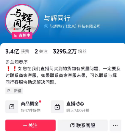 与辉同行直播间表现 - 10月9日至11日双十一专场累计吸引近7000万人观看,销售额超3亿元人民币 [1] - 截至10月15日,与辉同行连续四天开启“双11抢先购”,聚焦家电、家居家纺、3C数码和美妆品类,主播董宇辉连播三天且直播时间均大幅延长 [1] - 截至10月17日,与辉同行抖音账号粉丝量达到3295.2万 [1] - 自2024年1月9日正式开播至2025年1月8日,该直播间累计直播631场,带货销售额超102亿元人民币,累计订单量超1.6亿,成为2024年抖音预估带货销售额最高的直播间 [3] 兰知春序公司概况 - 兰知春序(西安)科技有限公司成立于2024年12月,法定代表人为董宇辉,注册资本500万元人民币 [7] - 公司经营范围包括日用百货销售、互联网销售、电影放映、酒类经营、广播电视节目制作经营等 [7] - 该公司由董宇辉间接持股,董宇辉任公司实际控制人、董事兼总经理 [9] - 兰知春序是董宇辉团队旗下账号之一,该团队旗下还包括与辉同行、子三省、终南远眺、长歌有和等账号 [5] 兰知春序业务动态 - 兰知春序账号同步开启“双11抢先购”,上线运动服、羽绒服等专场,直播时间从下午六点提前至每天下午四点 [3] - 截至报告期,兰知春序抖音账号粉丝达到371.7万 [3] - 2025年3月,公司新增广播电视节目制作经营许可证,许可机关为陕西省广播电视局 [11] - 公司获得旅行社业务经营许可,许可内容为境内旅游业务和入境旅游业务,有效期自2025年6月1日至2099年12月31日,许可机关为西安市文化和旅游局 [12]