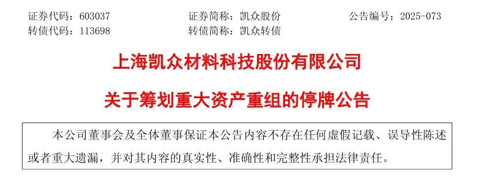 重要公告。 | 证券代码 | 证券简称 | 停复牌类型 | 停牌起始日 | 停牌期间 | 停牌终止日 | 复牌日 | | --- | --- | --- | --- | --- | --- | --- | | 603037 | 凯众股份 | A 股 停牌 | 2025/11/24 | | | | | 113698 | 凯众转债 | 可转债债券停牌 | 2025/11/24 | | | | 凯众股份(603037)11月21日晚间公告,公司正在筹划以发行股份及支付现金的方式收购安徽拓盛汽车 零部件股份有限公司(简称"安徽拓盛")的控制权,并向不超过35名特定投资者发行股份募集配套资金 (简称"本次交易"),募集资金全部用于支付本次交易对价,不存在补充流动资金的情形。经初步测 算,本次交易可能构成《上市公司重大资产重组管理办法》规定的重大资产重组。 11月21日,公司与全体交易对手方签署了《收购意向协议》,约定公司拟通过发行股份和支付现金方式 购买安徽拓盛60%股权,交易价格以公司聘请的具有证券期货业务资格的评估机构出具的资产评估报告 确认的评估值为基础,由各方协商确定。 上述协议为交易各方合作的意向性协议,系交 ...