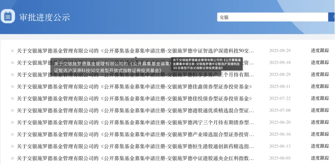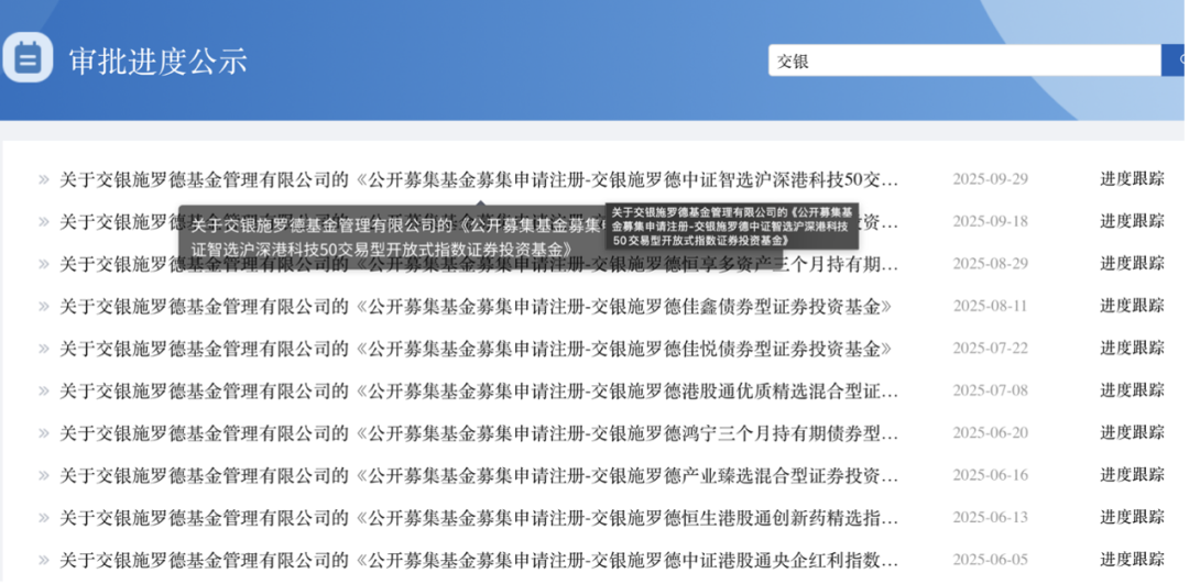 9月29日,交银施罗德基金上报了交银施罗德中证智选沪深港科技50ETF。这是继2011年9月交银深证300价值ETF成立后,交银施罗德基金时隔14年再度 发力ETF布局。 值得注意的是,9月25日,同为主动权益大厂的兴证全球基金,上报了其首只ETF产品——兴证全球沪深300质量ETF。 在国内指数投资大发展的背景下,ETF市场迎来显著扩容。截至9月26日,今年以来,易方达基金、华夏基金、富国基金、华泰柏瑞基金、南方基金、广 发基金、国泰基金的ETF管理规模增量都达到了千亿元以上。 交银施罗德基金重启ETF布局 证监会网站显示,9月29日,交银施罗德基金上报了交银施罗德中证智选沪深港科技50ETF。 | 별) 审批进度公示 | 交银 | | | | --- | --- | --- | --- | | > 关于交银施罗德基金管理有限公司的《公开募集基金募集申请注册-交银施罗德中证智选沪深港科技50交 ... | | 2025-09-29 | 进度跟踪 | | > 关于交银施罗德基金管理有限公司的《公开募集基金募集!会募集!会募集!会募集中请注册-交易能罗集中证智论深思科技 50交易型开放式指数证券投资基金】 | ...
