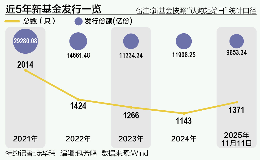 与火热的发行数量形成鲜明对比的是,新基金平均募集规模仅为7.82亿元。这一"数量增+平 均规模减"的现象,勾勒出2025年公募基金发行市场的深刻变局。 截至11月11日, 今年以来全市场新发基金数量已达1371只,创近三年新高 。 特约记者丨庞华玮 编辑丨包芳鸣 业内人士认为, 2025年公募基金发行市场已从依靠明星基金经理和爆款单品驱动的模式,彻 底转向了以"工具化、细分化、机构化"为特征的"广撒网"新阶段 。基金公司正在通过密集布 局低成本、高效率的工具产品,以适应市场变化和投资者日益理性的需求。这一趋势预计将 在未来几年持续深化。 策略转向:"广撒网"替代"造爆款" 今年以来公募基金的发行回暖,发行量创近三年新高。 Wind数据显示,按照认购起始日统计口径(下同),截至11月11日,年内公募基金的新基发 行数量达到1371只,超越2023年全年(1266只)和2024年全年(1143只),距离2022年全年 发行数量(1424只)仅一步之遥。 值得关注的是,今年以来发起式基金盛行。 年内共有334只新基金采用发起式形式设立,占比 约四分之一,且多为股票型基金 。 这与发起式基金成立门槛低的特点有关:普通 ...