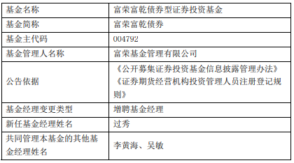 中国经济网北京10月29日讯 今日,富荣基金公告,富荣富乾债券增聘过秀。 过秀2008年7月至2012年6月在招商基金管理有限公司担任基金会计,2012年6月至2013年5月在国海 证券股份有限公司担任固定收益研究员,2013年5月至2015年7月在世纪证券有限责任公司担任债券交易 员,2015年7月至2020年7月在摩根士丹利华鑫基金管理有限公司担任债券交易员,2020年8月加入富荣 基金,历任富荣基金管理有限公司专户部投资经理、兼专户部总经理助理,现任富荣基金管理有限公司 基金经理。 富 荣 富 乾 债 券 A/C 成 立 于 2018 年 2 月 7 日 , 截 至 2025 年 10 月 28 日 , 其 今 年 来 收 益 率 为-0.07%、-0.20%,成立来收益率为-7.83%、-15.44%,累计净值为0.9287元、0.8556元。 | 基金名称 | 富荣富乾债券型证券投资基金 | | --- | --- | | 基金简称 | 富荣富乾债券 | | 基金主代码 | 004792 | | 基金管理人名称 | 富荣基金管理有限公司 | | 公告依据 | 《公开募集证券投资基金信息披露管理办法》 ...