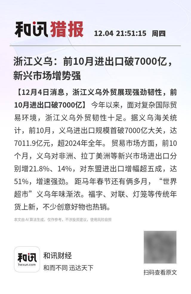 【12月4日消息,浙江义乌外贸展现强劲韧性,前10月进出口破7000亿】今年以来,面对复杂国际贸易 环境,浙江义乌外贸韧性十足。据义乌海关统计,前10月,义乌进出口规模首破7000亿大关,达7011.9 亿元,超2024年全年。 贸易市场方面,前10个月,义乌对非洲、拉丁美洲等新兴市场进出口分别增 21.8%、14%,对东盟进出口增幅超五成,达51%,增速强劲。 距马年春节还有俩多月,"世界超市"义 乌年味渐浓。福字、对联、灯笼等传统年货上新,不少创意好物也热销。 【12月4日消息,浙江义乌外贸展现强劲韧性,前 10月进出口破7000亿】 今年以来,面对复杂国际贸 易环境,浙江义乌外贸韧性十足。据义乌海关统 计,前10月,义乌进出口规模首破7000亿大关,达 7011.9亿元,超2024年全年。贸易市场方面,前10 个月,义乌对非洲、拉丁美洲等新兴市场进出口分 别增21.8%、14%,对东盟进出口增幅超五成,达 51%,增速强劲。距马年春节还有俩多月,"世界 超市"义乌年味渐浓。福字、对联、灯笼等传统年 货上新,不少创意好物也热销。 本文由 Al 算法生成,仅作参考,不涉投资建议,使用风险自担 和讯财经 和而 ...