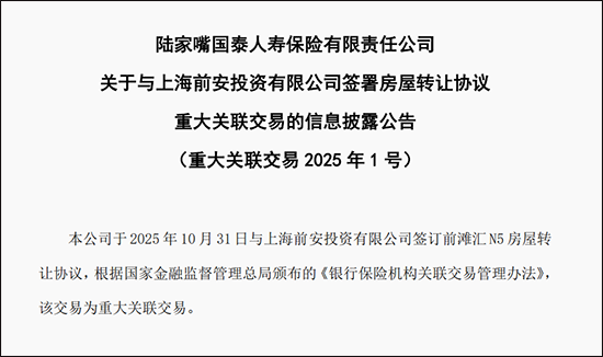 登录新浪财经APP 搜索【信披】查看更多考评等级 陆家嘴国泰人寿网站11月11日发布公告称,公司已于10月31日完成收购位于上海浦东新区前滩汇N5栋 的整栋写字楼,交易总价为8.95亿元,建筑面积约1.33万平方米,该楼将作为公司总部办公场所使用。 据了解,此次交易是前滩汇11栋写字楼的首宗交易,也是陆家嘴集团2025年度第6单大宗资产交易。 公告文件显示,本次收购对象为上海前安投资有限公司。并且,由于前安投资与公司股东上海陆家嘴金 融发展有限公司(持有50%股权),同受上海陆家嘴(集团)有限公司控制,因此前安投资被认定为陆 家嘴国泰人寿的关联方。 据了解,其总部之前位于前滩中心38层。前滩中心是上海前滩板块目前最高的塔楼,由陆家嘴集团开 发。 前滩中心 视频截图 另据陆家嘴国泰人寿网站介绍,陆家嘴国泰人寿保险有限责任公司成立于2004年,是大陆首家海峡两岸 合资的寿险公司,总部位于上海,注册资本30亿元人民币,台湾地区的国泰人寿保险股份有限公司和上 海陆家嘴金融发展有限公司分别持股50%。公司目前已在全国设立11家分公司和近50个营销网点,开发 销售寿险、健康险、意外险及年金险等百余种产品。截至2024年底 ...