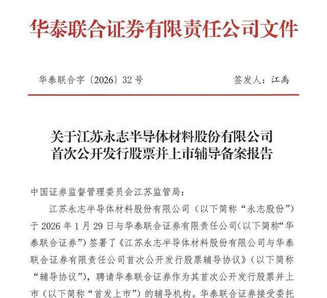 公司基本情况 - 公司全称为江苏永志半导体材料股份有限公司,成立于2007年10月15日,注册地位于江苏省泰州市泰兴市三联村 [4][5] - 公司注册资本为11,333.1472万元,法定代表人为熊志 [5] - 公司为国家级专精特新“小巨人”企业,行业分类属于计算机、通信和其他电子设备制造业 (C39) [1][5] - 公司主要从事半导体芯片封装材料的研发、生产和销售,主要产品包括引线框架和封装基板 [1] 股权结构与控股股东 - 控股股东熊志直接持有公司4,363.1751万股股份,并通过担任泰兴永志、江阴永志执行事务合伙人控制公司583.4809万股股份的表决权 [1][5] - 熊志合计可控制公司4,946.6560万股股份,占公司总股本的43.6477% [1][5] 首次公开发行(IPO)进展 - 公司于2026年1月29日与华泰联合证券签署了首次公开发行股票辅导协议,正式启动IPO进程 [4] - 辅导机构为华泰联合证券有限责任公司,律师事务所为江苏世纪同仁律师事务所,会计师事务所为北京德皓国际会计师事务所(特殊普通合伙) [1][4][7] - 公司股票已于2026年1月29日起在全国中小企业股份转让系统挂牌公开转让 [5] 历史融资与投资方 - 公司历史上获得了多家知名投资机构的投资,包括毅达资本、新洁能、中金传化基金、新潮集团等 [1] - 根据融资历程,2021年12月14日公司完成A轮融资,融资金额为“数亿人民币”,投资方包括新洁能、中金传化基金等 [2] - 2025年8月12日公司完成B轮融资,投资方为毅达资本,融资金额未披露 [2] - 更早期的融资包括2021年2月2日的Pre-A轮(投资方为新潮集团等)和2020年9月22日的天使轮(投资方为新潮集团等) [2]