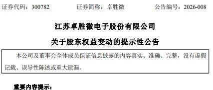 公司核心股东权益变动 - 公司董事长、总经理许志翰通过离婚财产分割,将其直接持有的1715万股无限售条件流通股(占公司总股本的3.21%)分割至其前妻张昱名下[1] - 本次权益变动后,许志翰直接持有公司股份数量由34,304,010股(占总股本6.41%)变为17,152,005股(占总股本3.21%),张昱则从零持股变为持有17,152,005股(占总股本3.21%)[1][4] - 张昱承诺,在许志翰担任公司董事及高级管理人员期间,其每年转让的股份不得超过所持股份总数的25%,且每年可出售的股份数量不超过当年所持股份总数的10%[1] - 张昱无条件且不可撤销地将其所持股份对应的全部表决权、提名和提案权、参会权、监督建议权等非财产性权利全权委托给许志翰行使[1] - 此次分割的股份,按公司截至2月11日402亿元的市值计算,价值约12.9亿元[1] 公司历史股权变动与股东结构 - 公司实控人之一唐壮与易戈兵曾于2023年6月解除婚姻关系并进行财产分割,唐壮将所持大部分公司股权转让给易戈兵,使其不再是持股5%以上的股东,按当时收盘价计算,易戈兵分走近34亿元[2] - 根据最新权益变动后的股东列表,无锡汇智联合投资企业(有限合伙)持股59,209,013股(占11.07%),FENG CHENHUI (冯晨晖) 持股38,887,861股(占7.27%),YI GEBING (易戈兵) 持股30,084,742股(占5.62%),TANG ZHUANG (唐壮) 持股8,161,831股(占1.53%)[4] - 上述主要股东合计持有公司股份170,647,457股,占总股本的31.90%,权益变动前后该合计持股数量及比例未发生变化[4] 公司基本情况与市场表现 - 公司为国产射频龙头企业,其射频前端分立器件和射频模组产品主要应用于智能手机等移动智能终端,同时还可应用于智能穿戴、通信基站、汽车电子、蓝牙耳机、VR/AR设备及网通组网设备等需要无线连接的领域[5] - 公司董事长、总经理许志翰,1972年出生,拥有清华大学计算机科学与技术专业学士及硕士学位、美国圣克拉拉大学电子工程专业硕士学位以及中欧工商学院工商管理EMBA学位,2024年从公司获得的税前报酬总额为312.08万元[1] - 截至2月11日收盘,公司总市值为402亿元,总股本为5.35亿股,当日成交额为3.43亿元,换手率为1.01%[6]